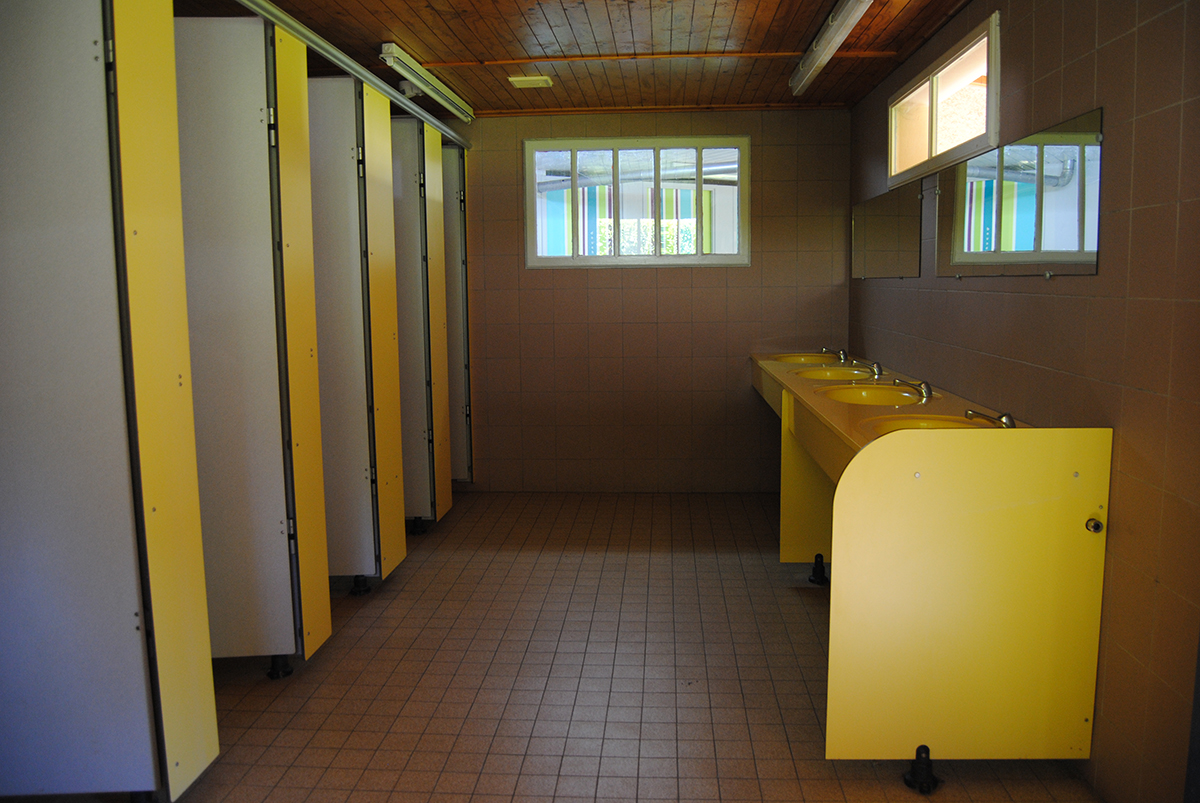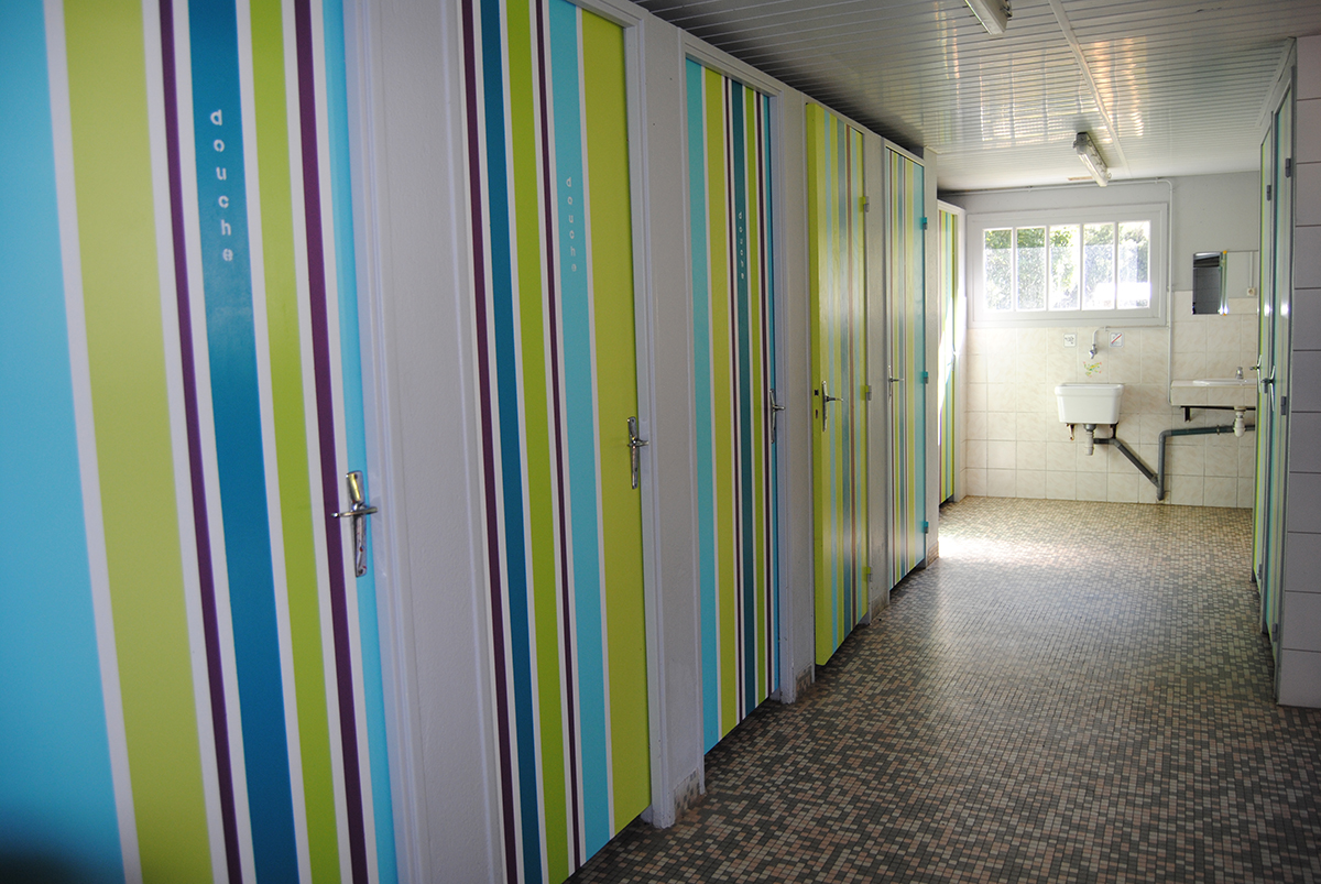 Equipements : Deux Sanitaires avec fourniture d'eau chaude offerte, douches et wc, (un pour personne handicapée), bacs vaisselle, lave-linge et sèche-linge à jetons et prêt du fer à repasser